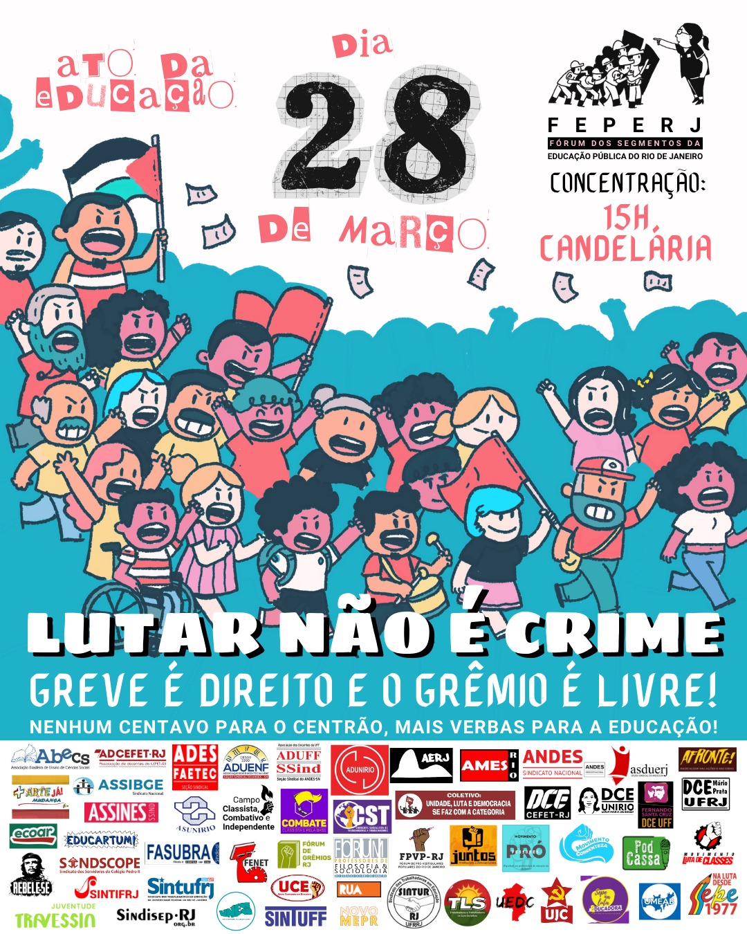 O FEPERJ – Fórum dos Segmentos da Educação Pública do Estado do Rio de Janeiro convoca todas as comunidades escolares, estudantes, profissionais de educação e apoiadores para o Ato da Educação, que acontecerá no dia 28 de março (sexta-feira), às 15h, na Candelária.