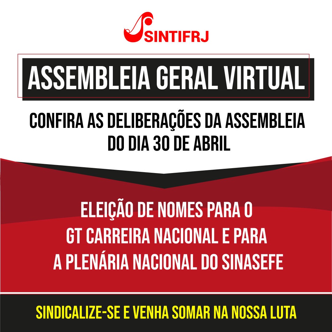 Na tarde desta quarta-feira, dia 30 de abril, o SINTIFRJ realizou mais uma Assembleia Geral Virtual, que pautou, além dos informes gerais, os informes do Encontro Regional de Mulheres Sudeste do SINASEFE, os informes sobre a participação e a realização 1º Encontro da Diversidade Sexual do SINASEFE, os informes sobre as reuniões do GT Carreira da seção do SINTIFRJ e a eleição das delegadas(os) e observadoras(es) para a 201ª Plenária Nacional do SINASEFE.