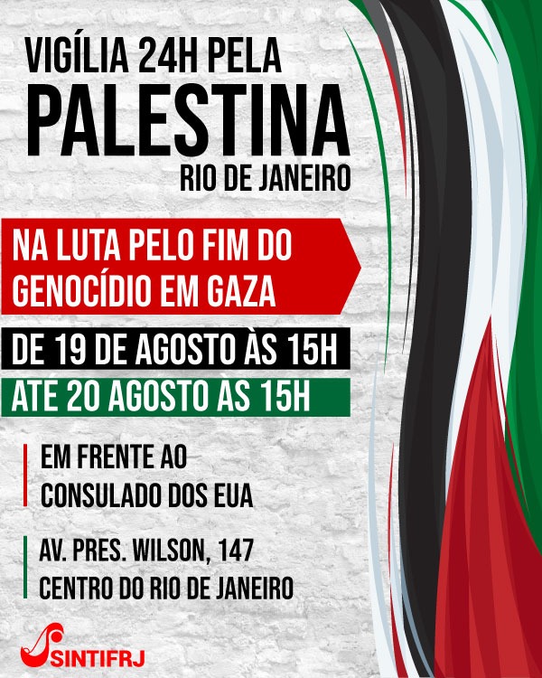 É preciso muita mobilização e luta para acabar com essa covardia de uma vez por todas. Por isso, no dia 19 de agosto, vamos fazer a nossa parte: será realizada uma vigília de 24 horas em defesa do povo palestino, em frente ao Consulado dos EUA (Av. Pres. Wilson, 147 – Centro do Rio de Janeiro).